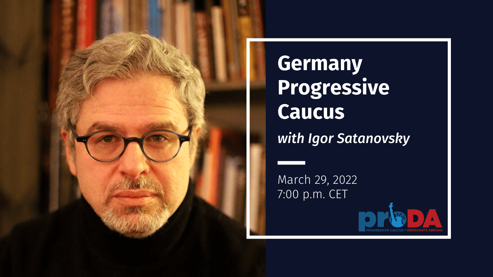 Join the Germany Progressive Caucus on March 29 at 7:00 p.m. CET for our monthly meeting. In this session, we will be joined by special guest Igor Satanovsky, a Ukrainian-American poet, visual artist, and publisher based in New York City. He will share with us some of his poetry as well as take questions from participants. Following the reading, we will discuss what we can do as U.S. citizens to assist during the crisis that has forced so many people to flee their homes. We look forward to an enriching conversation.