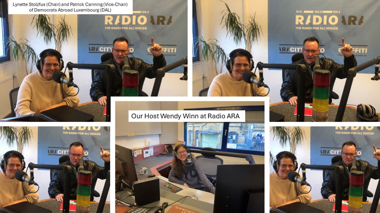 On Thursday April 11, 2024, Lynette Stoltzfus (Chair) and Patrick Canning (Vice-Chair) of Democrats Abroad Luxembourg (DAL) had the opportunity to speak about the plight of Americans living abroad on Radio ARA (87.8 102.9 and 105.2). They were hosted by Wendy Winn of ARA on the Happy Hour Radio program that airs every Thursday from 18:30 to 20:00. Here’s a link to the recording of the live stream Addressing issues faced by Americans abroad (youtube.com).
