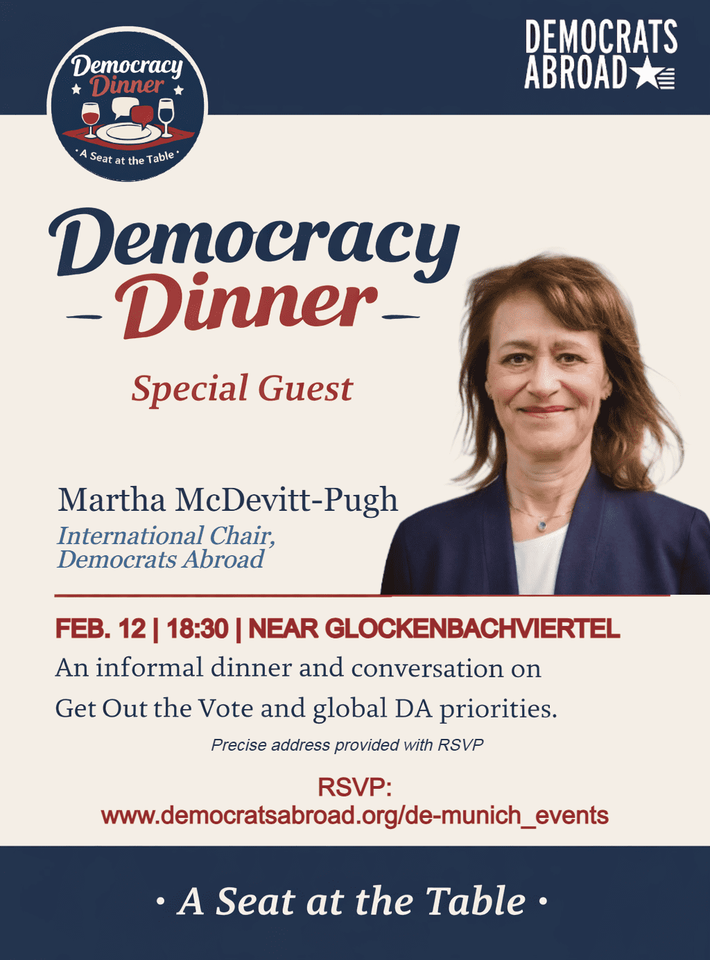 Join us for a special edition of our Democracy Dinner featuring Martha McDevitt-Pugh, International Chair of Democrats Abroad.