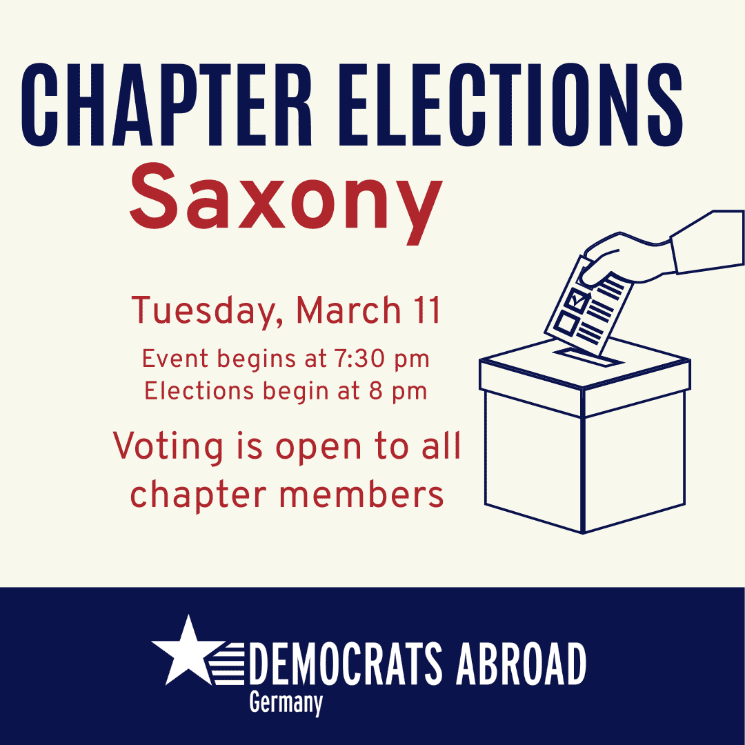 Every two years, the chapters of Democrats Abroad Germany hold their chapter elections for leadership positions. This year on Tuesday, March 11 we will be voting for our new Chair and Vice Chair. Information about how to run and the voting process should be in your email inbox as a message from the Chapter Nominations and Elections Committee (CNEC), or you can go here to read more! All positions will receive training from DA and can draw from the experience of past officers.