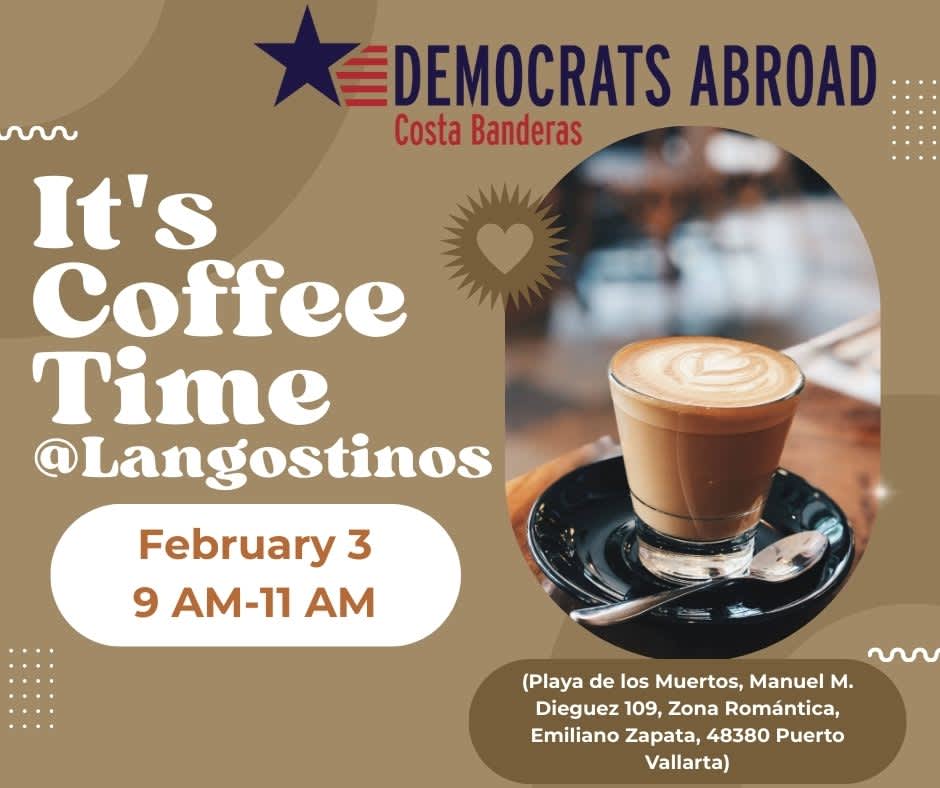 …for our monthly Coffee Time at Langostinos! In addition to sharing information on local events, we will provide updates on TAKE ACTION/Resistance activities and upcoming elections! We can answer any voter registration/ballot request questions during the event. This is a safe space to share your thoughts and ideas! It is also a great opportunity to meet other U.S. citizens living in Puerto Vallarta, while enjoying your favorite morning beverage and breakfast dish!