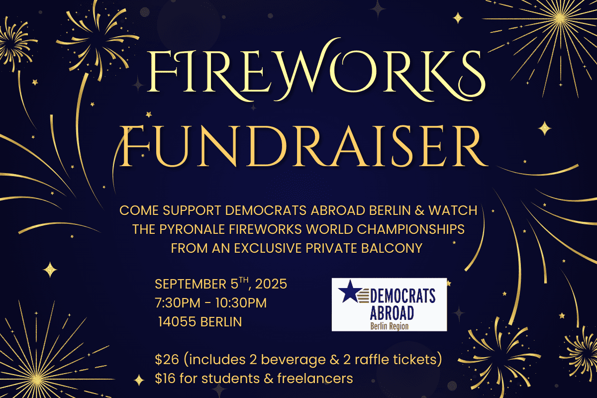 Join us for a spectacular evening of cocktails, light bites, and breathtaking fireworks — all in support of Democrats Abroad Berlin. We’ll gather in a private residence next door to the Fireworks Pyronale World Championship, giving you an unbeatable view from the tallest apartment building in Berlin.
