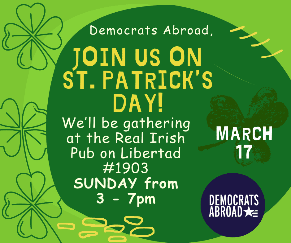 Green beer, Guinness on draft, Fish and Chips, and more are available for order. Come see your friends and meet some new members of Democrats Abroad. Bring a friend, hear the music, and relax. Located on Libertad, corner with Calle Colonias, just behind the U.S. Consulate.