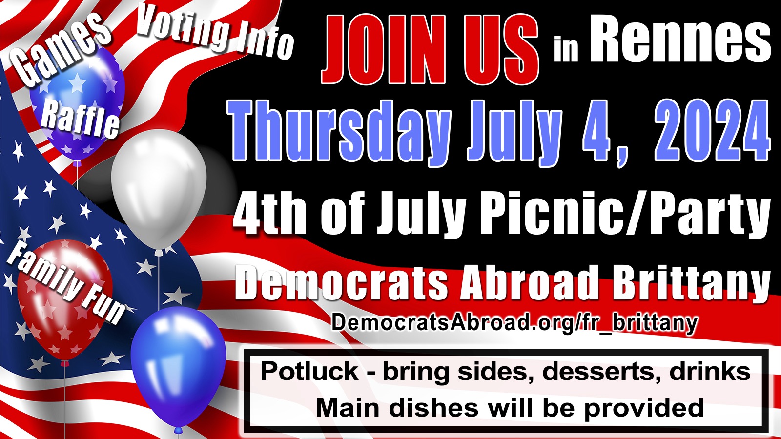 We are going to have so much fun! Join us for a potluck/party on the 4th of July for American Democrats and their family and friends at a park in Rennes on July 4th starting at 6:15 pm.