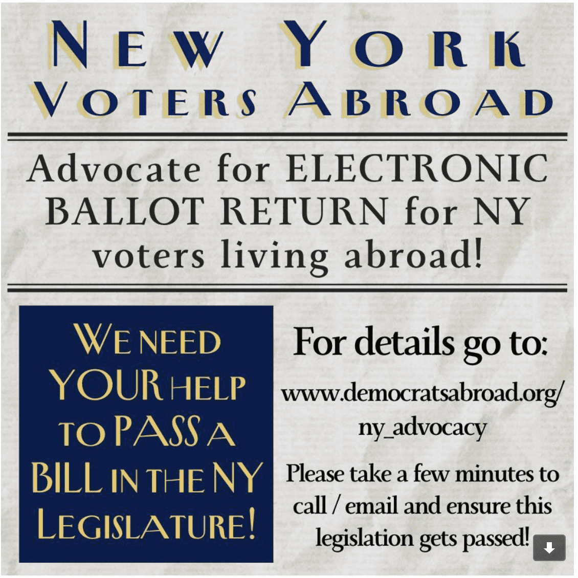 The Dems Abroad New York State Team is supporting Senate bill S2892 which will dispense with the onerous task of postal mailing our ballots back to our counties in New York. You don't have to be a New Yorker to support this change to make overseas voting more accessible for all. Reach out State Senator Myrie TODAY.