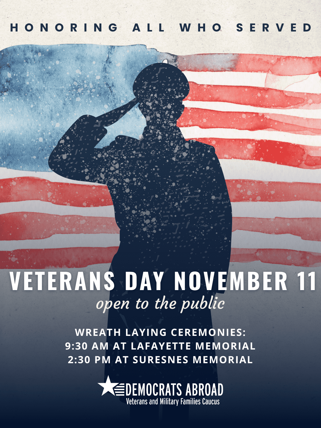 Join the Democrats Abroad Veterans and Military Families Caucus to honor our veterans with a wreath-laying ceremony. There will be a second ceremony in the afternoon at Suresnes Memorial.