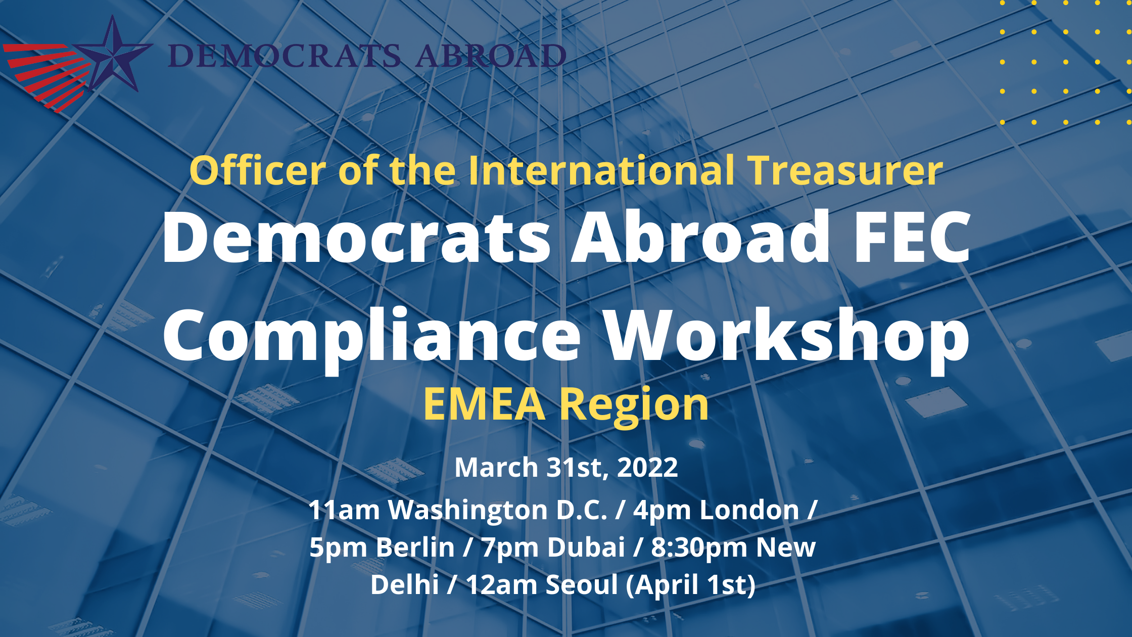The Office of the International Treasurer invites country committee and chapter chairs and treasurers to the FEC Compliance Workshop for the EMEA Region. In completing this workshop, participants will be able to understand key FEC concepts, complete Democrats Abroad FEC forms, and promote best financial practice at the country committee and chapter levels. Please note, you must have a Democrats Abroad Confidentiality Agreement on record to participate.