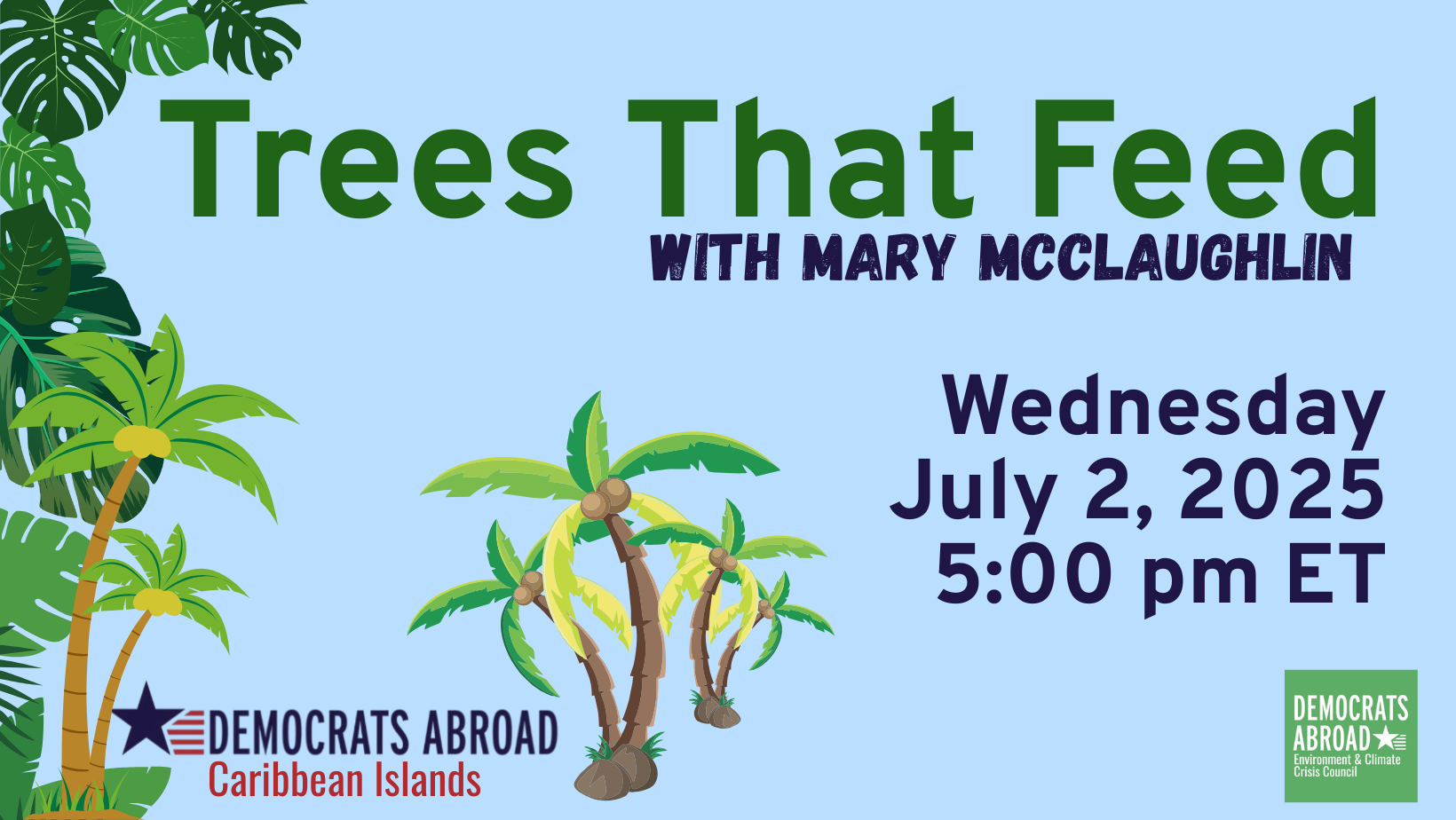 Do you love trees, the environment and lower food prices? Please join Democrats Abroad Caribbean Islands, in cooperation with the global ECCC, for a webinar on Wednesday, July 2nd at 5:00 pm ET/11:00 pm CET. Our guest speaker is Mary McLaughlin from the Trees That Feed Foundation (https://treesthatfeed.org), whose mission is planting fruit trees to feed people, create jobs, and benefit the environment — a quest now more important than ever in the Caribbean Islands and elsewhere, as we face accelerating climate change and skyrocketing food prices.
