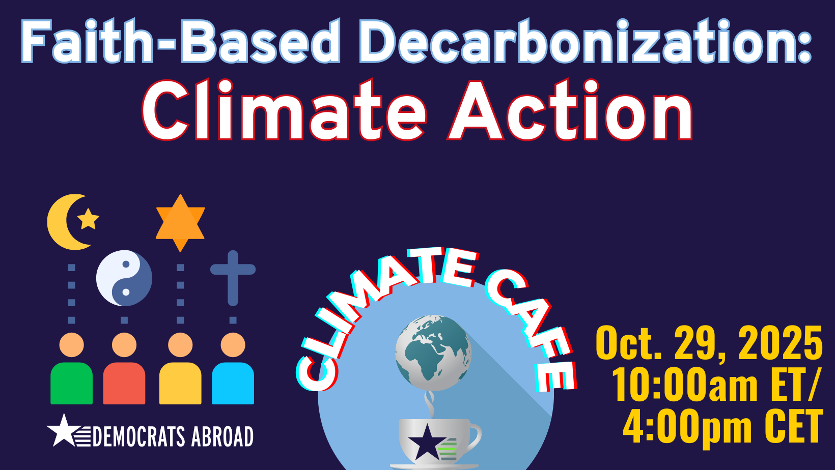 Please join us for our October Climate Café on the 29th at 10am ET/4pm CET, where we will explore the important opportunity for climate action in faith-based organizations. Our special guest speaker is Jack Angus Nevin, the Chair of Democrats Abroad Scotland and the Net Zero Innovation Coordinator at the Scottish Episcopal Church.