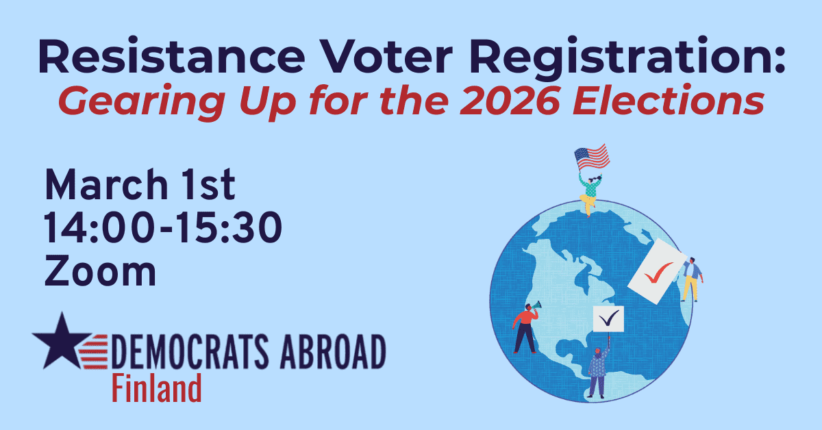 Please join us for our virtual voter registration and information event on March 1st at 2:00 pm EET for Finland based Americans. Bring your questions and concerns, and we are happy to share the why and the how!