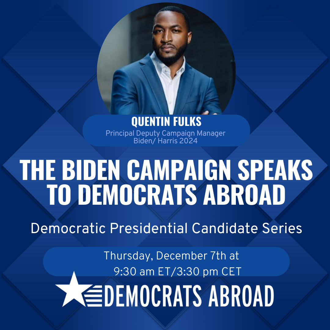 Join our call with Quentin Fulks, Principal Deputy Campaign Manager Biden-Harris 2024. He'll spend time with Democrats Abroad sharing President Biden’s policy stance on Americans abroad issues and other issues, too, time permitting. RSVP HERE