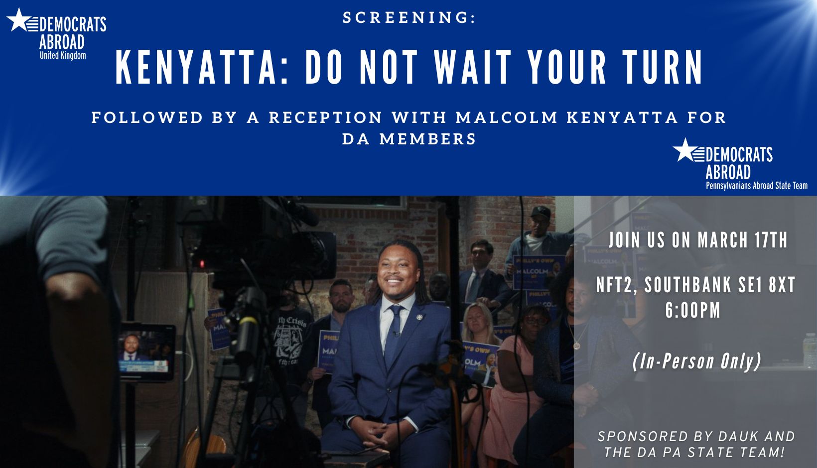 RSVP early for this exciting opportunity to attend the world premiere of Pennsylvania State Representative Malcolm Kenyatta’s biopic Kenyatta:Do Not Wait Your Turn.We will then meet with Rep. Kenyatta at a reception for DA members on March 17 at The British Film Institute on London’s Southbank..
