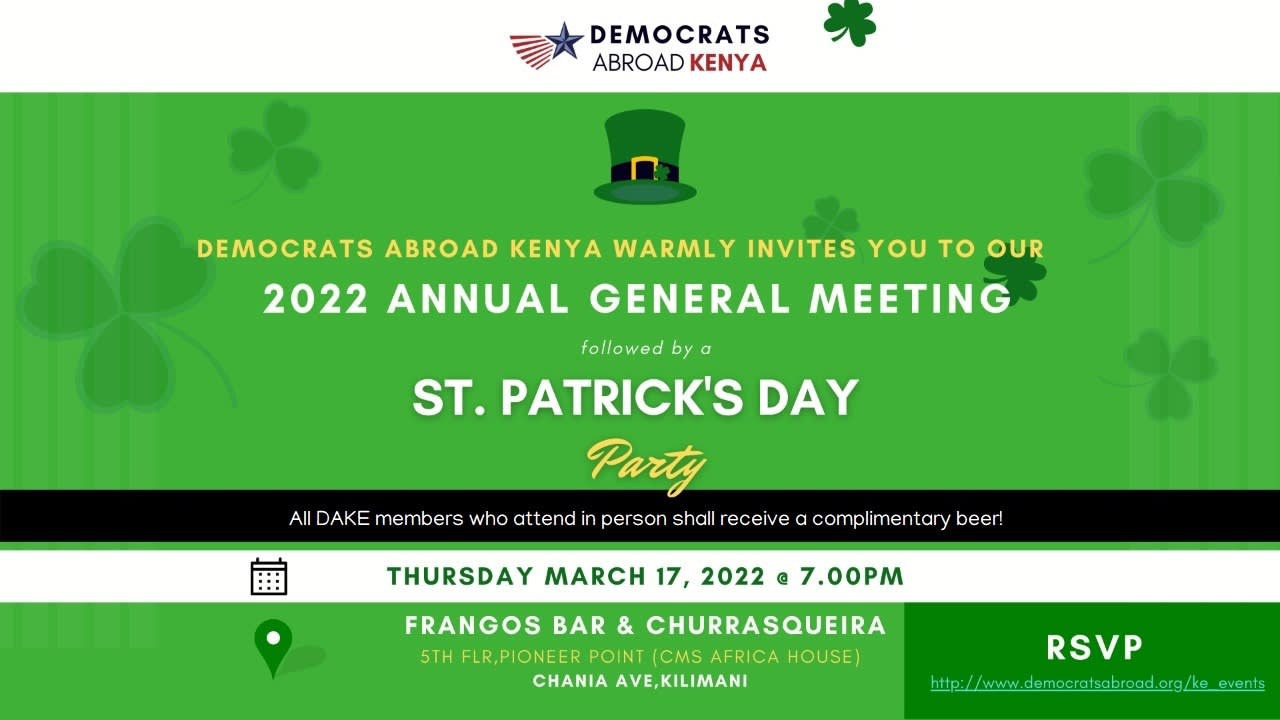 Democrats Abroad Kenya ANNUAL GENERAL MEETING and St. Patrick's Day Celebration!