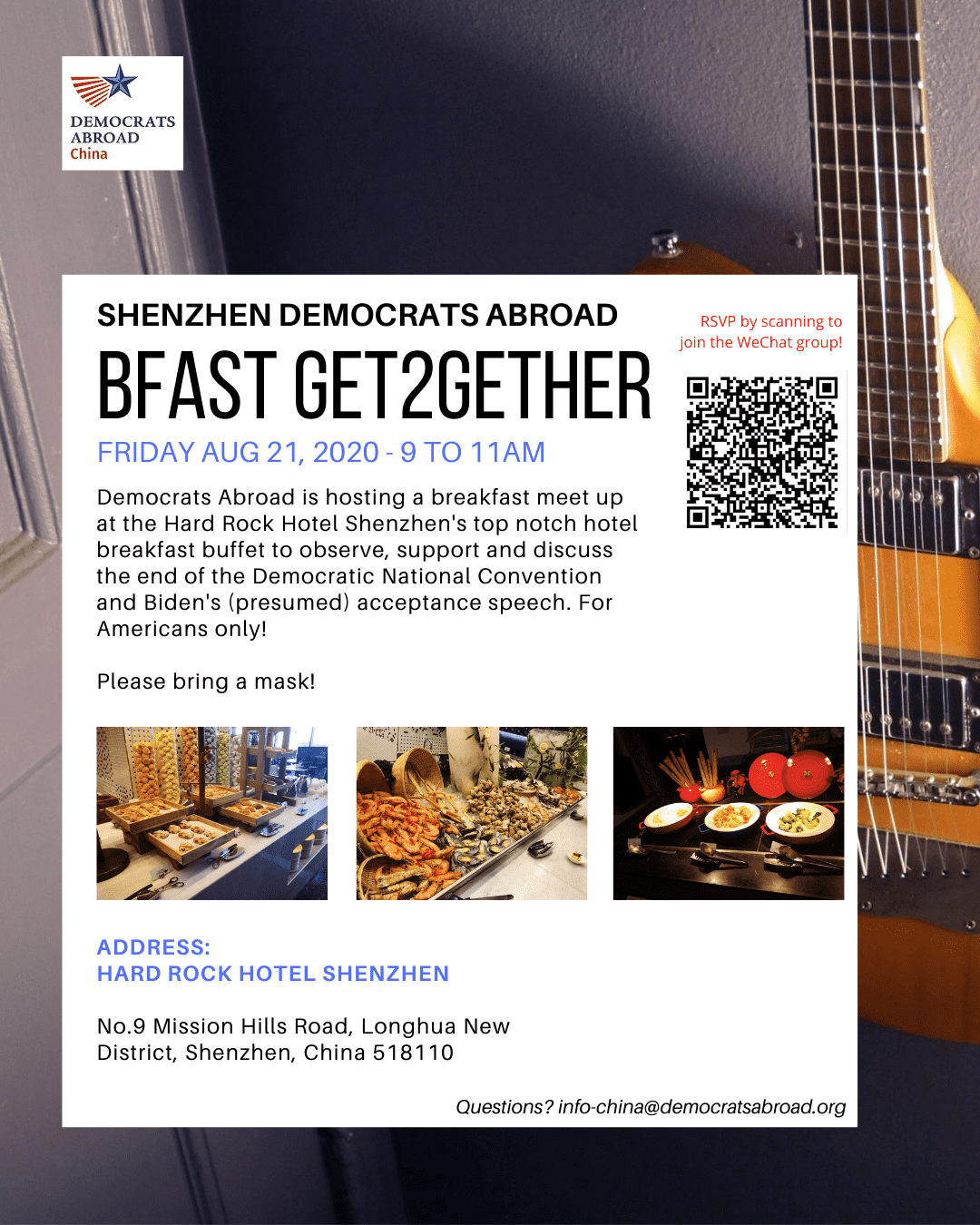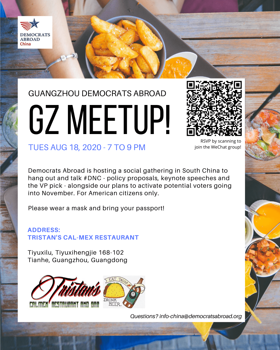 We have two events for you in this upcoming week for members in the Pearl River Delta area who'd like to connect with likeminded Americans to discuss the ongoing Democratic National Convention over food and drinks. Guangzhou will host a dinner discussing the keynotes so far on Tuesday, August 18. And near the end of the convention, Shenzhen will host a breakfast buffet for watching Biden's (presumed) acceptance speech.