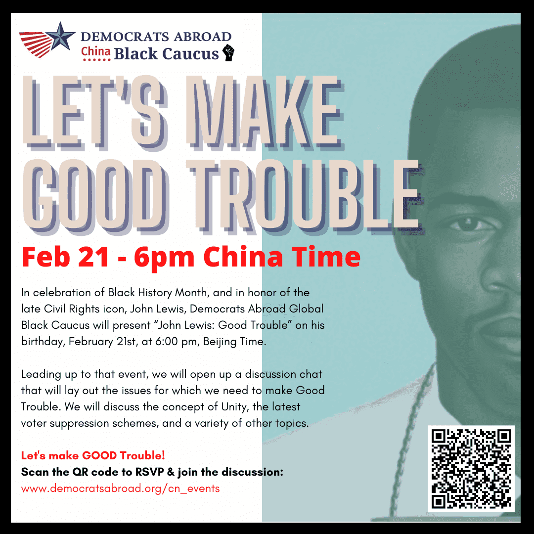 In celebration of Black History Month, and in honor of the late Civil Rights icon, John Lewis, Democrats Abroad Global Black Caucus will present “John Lewis: Good Trouble” on his birthday. Leading up to that event, we will open up a discussion chat that will lay out the issues for which we need to make Good Trouble. We will discuss the concept of Unity, the latest voter suppression schemes, and a variety of other topics.