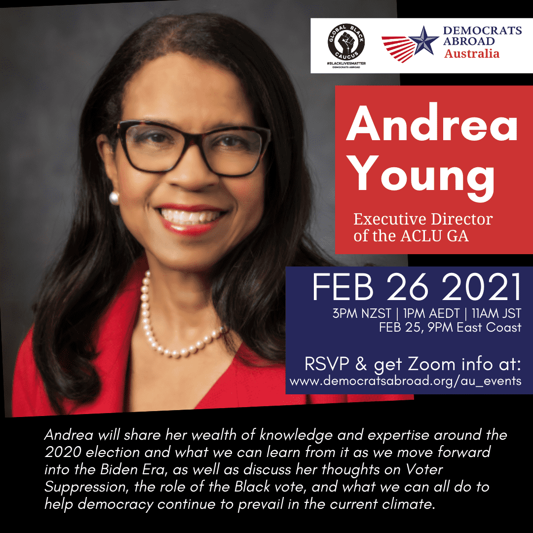 Join Democrats Abroad Global Black Caucus for a Conversation with Andrea Young, Executive Director of the ACLU of GA. Andrea will share her wealth of knowledge and expertise around the 2020 election and what we can learn from it as we move forward into the Biden Era. We will discuss with Andrea her thoughts on Voter Suppression, the role of the Black vote, and what we can all do to help democracy continue to prevail in the current climate.