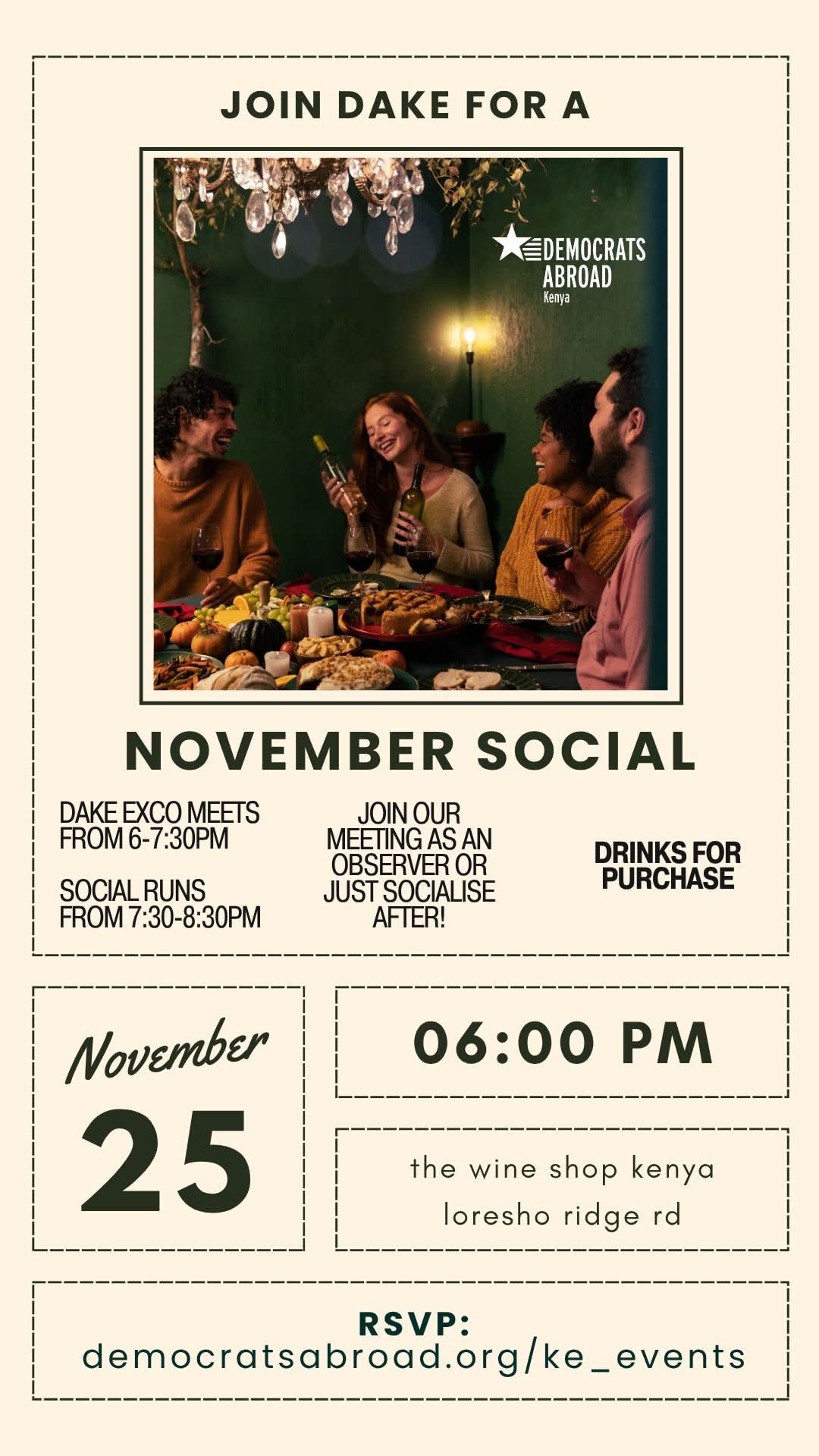 Join Democrats Abroad Kenya for Dake’s November Social — an evening of fun, great company, and good vibes. 💙❤️