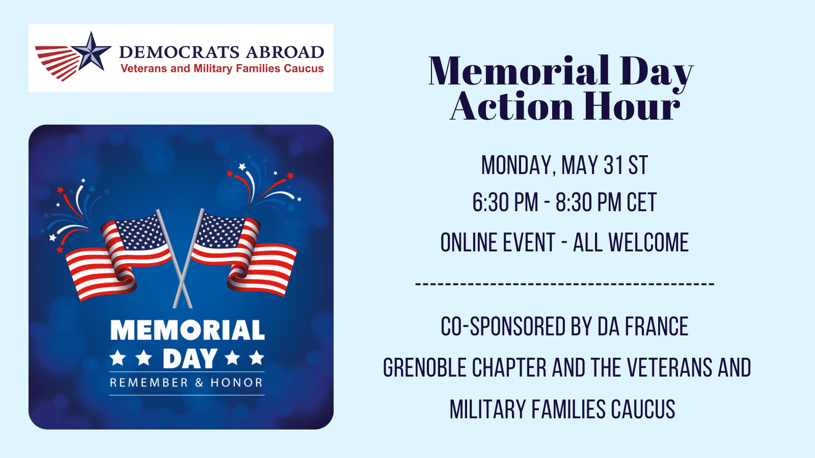Join DAF Grenoble chapter and DAF Veterans and Military Families caucus in a Memorial Day Action Hour so special that we need TWO hours. You'll hear US veterans tell their stories, and we'll do an action item together to help our military. Don't miss this chance to honor our veterans. -