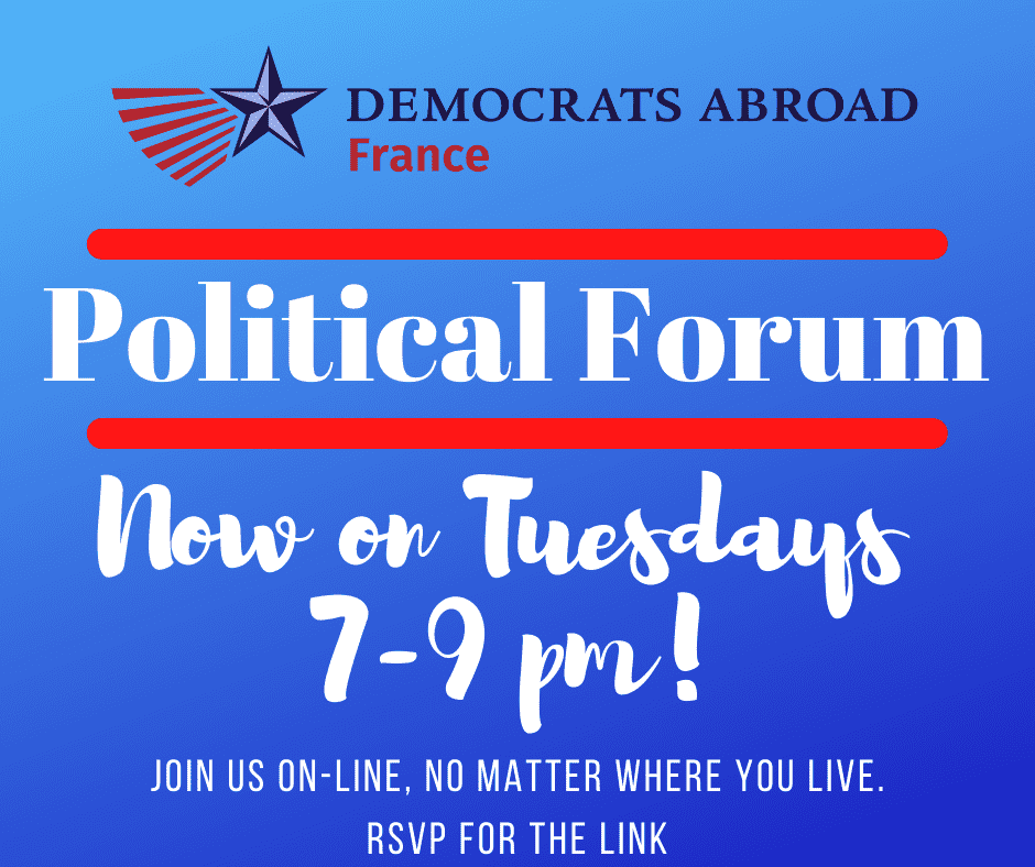 Join Political Forum host Jean-Pierre LaRochelle and leaders of Democrats Abroad France in a free-wheeling discussion of current events and news of the week, and share your views with other attendees. Send your questions to [email protected]