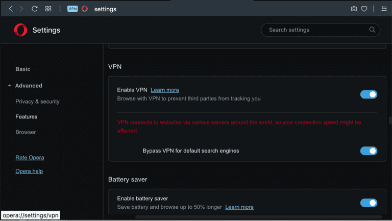 - In the Settings window, scroll down to “Advanced” click it, then scroll to “VPN”. Click the slider button to enable VPN.