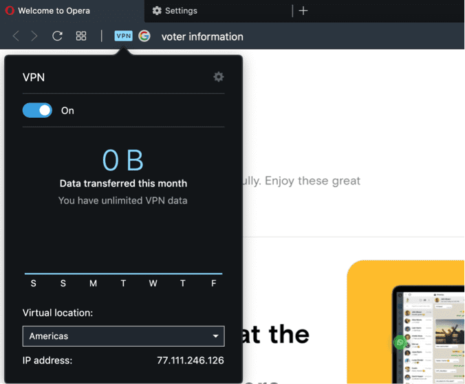 - When VPN is enabled, you’ll see a small button appear in your search bar. Clicking that will open a new window where you can select the virtual location of your VPN. Choose “Americas” from the dropdown list.