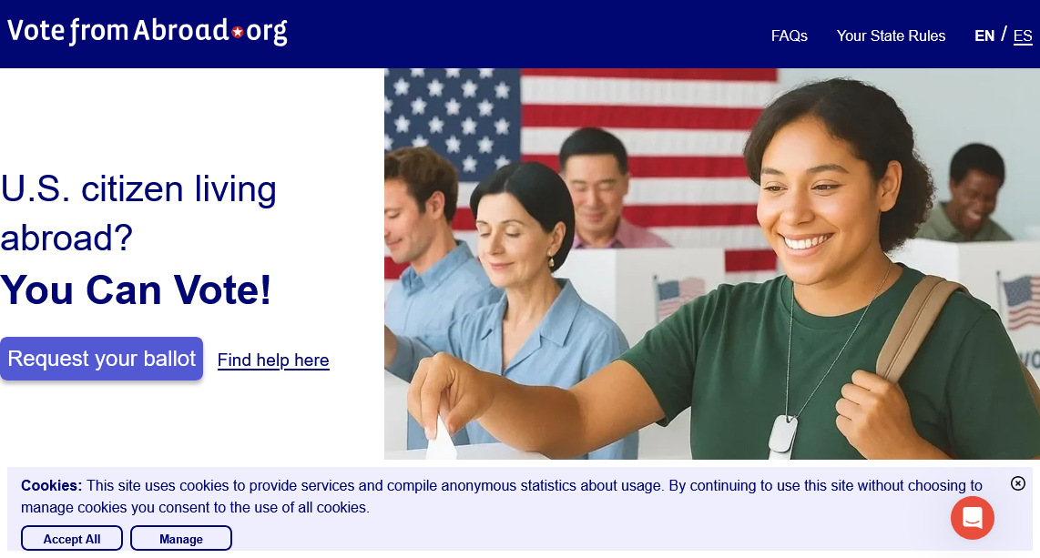 Visit VotefromAbroad.org to fill out your absentee ballot request, also known as the Federal Post Card Application (FPCA)— it only takes 5-10 minutes! If you're not registered to vote, the FPCA serves as a voter registration form as well. Be sure to choose the option to receive your ballot via email!