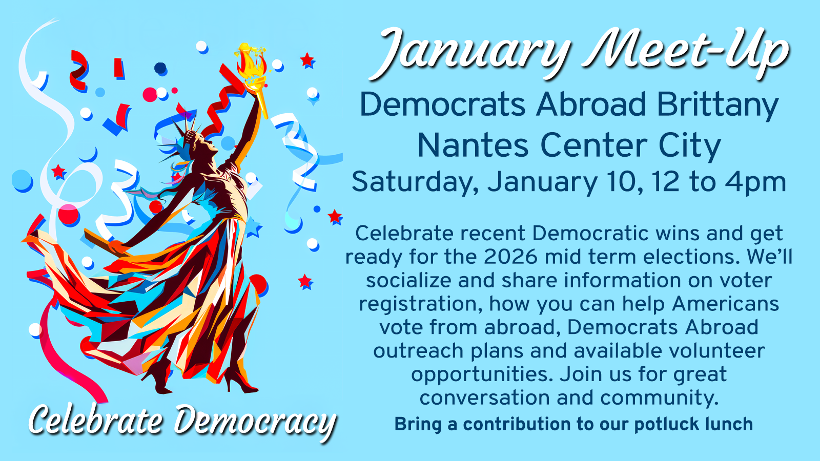 There’s no donation required to attend, but if you're able, we hope you’ll consider a contribution of 3 € or more. All contributions support future chapter events and Get Out the Vote for 2026. And thank you!