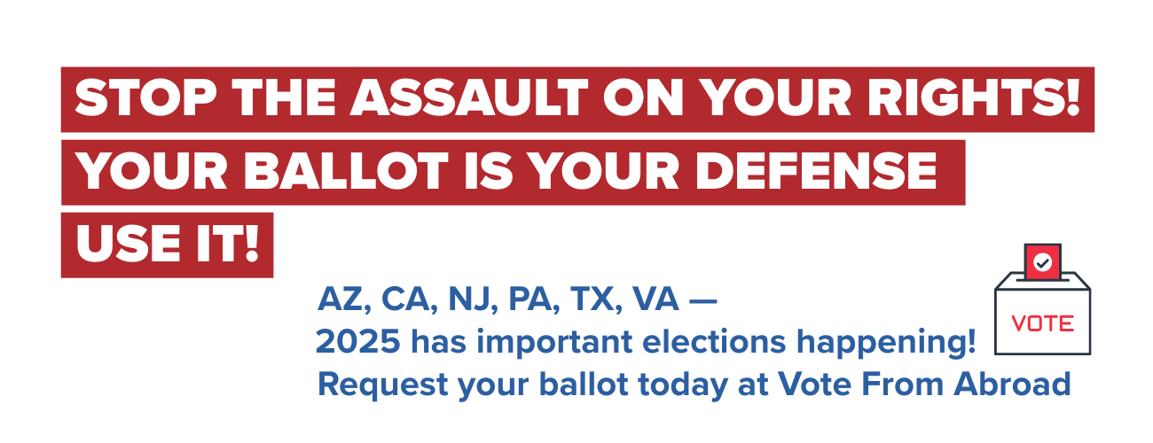 Go to VoteFromAbroad.org to register/request your ballot for the 2025 election year.