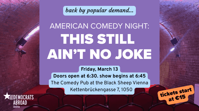 Join us as some of Vienna's best American comedians perform in this exclusive fundraising event for Democrats Abroad Austria! The line-up will surely have us rolling in the aisles.