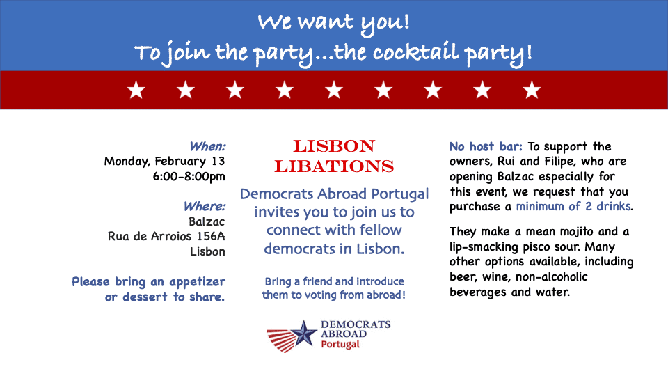 We are gathering at Balzac - a wonderful cocktail bar. Please bring an appetizer or dessert to share and connect with fellow Democrats in Lisbon. To support the owners, Rui and Filipe, who are opening for us, we request that you purchase a minimum of 2 drinks (nonalcoholic options available). We look forward to seeing you!