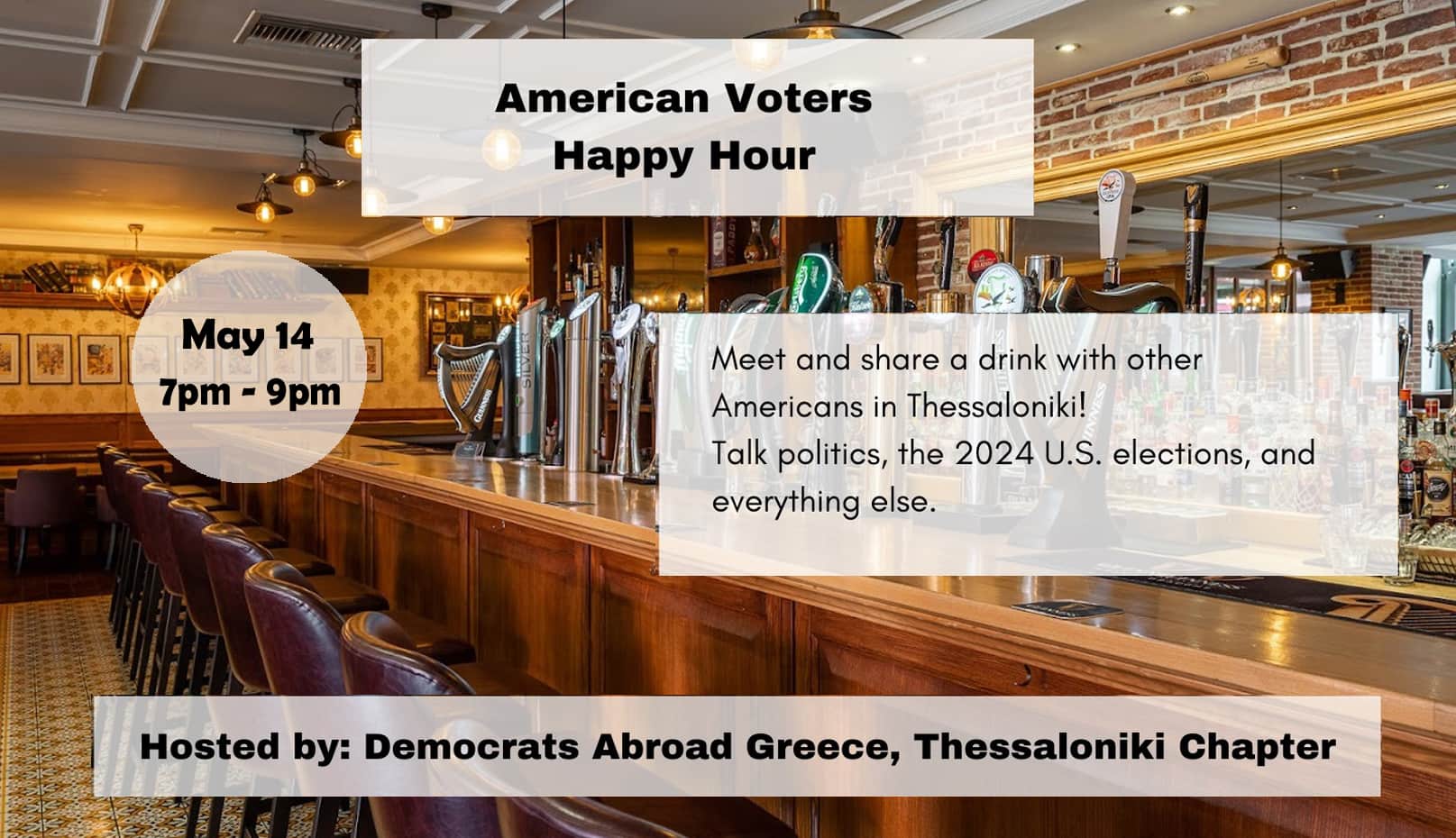 Thessaloniki Chapter hosts Happy Hours on the 2nd Tuesday of the month, 7 pm - 9 pm, at The Dubliner, Katouni Street 16, in the downtown neighborhood of Ladadika.