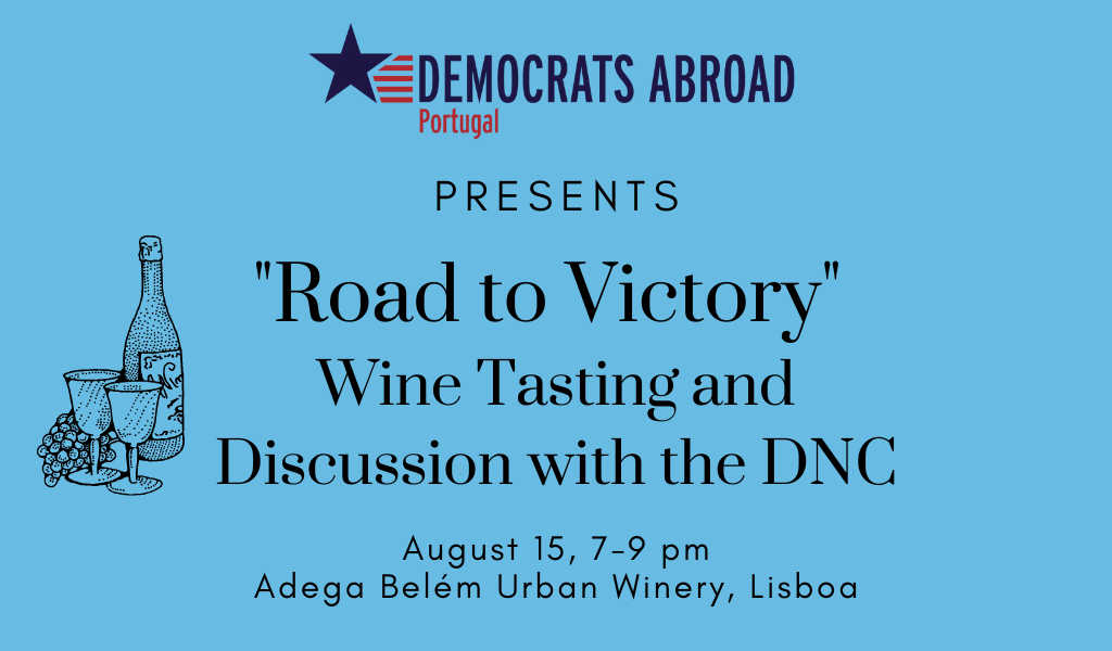 Democrats Abroad Portugal is thrilled to present a “Road to Victory” wine tasting and discussion with leaders from the Democratic National Committee and the Democrats Abroad global organization. Join DNC Vice Chair Ken Martin, Democrats Abroad International Chair Candice Kerestan , Eastern Regional Director of the Association of State Democratic Committees Jarryd Rauch, and our DA Portugal leadership to learn more about how Democrats in the US and abroad are working to secure big victories in November! DA Portugal leaders will share how you can get involved in helping to ensure that the midterm elections are a huge success for Democrats at every level. The gathering will be on August 15 at 7 PM. Join us if you can.