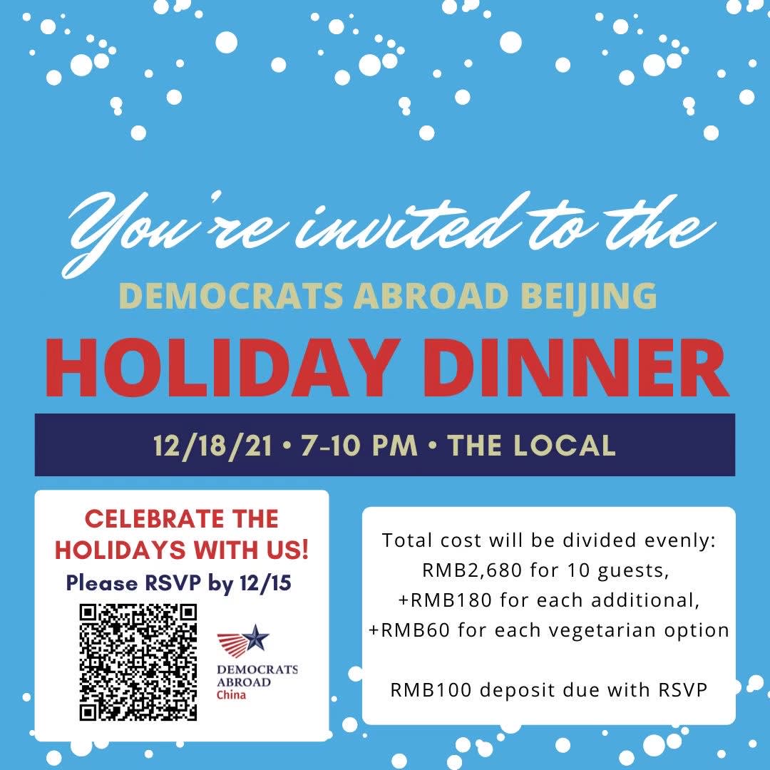 Come celebrate the holidays with Democrats Abroad in Beijing! We will eat, drink, and enjoy the holiday together.