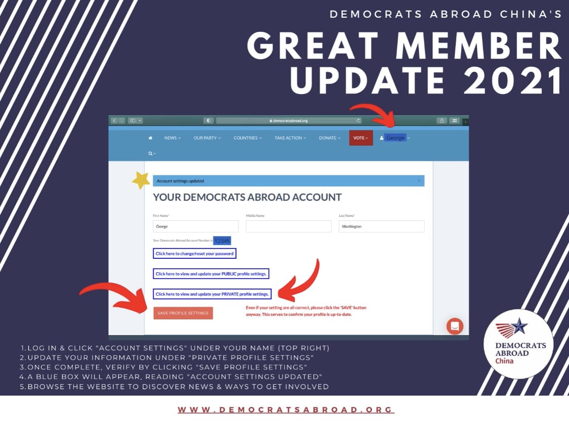 To UPDATE and VERIFY your member information on our website, please log in at www.DemocratsAbroad.org, or contact us at [email protected].
