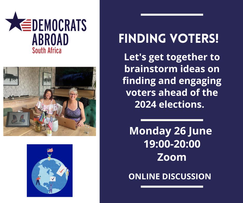 Our primary work is to find, engage and mobilise potential US voters in SA. You’ll see below we have scheduled two June brainstorming sessions focused on member development & engagement - please join in, volunteer or email any ideas!