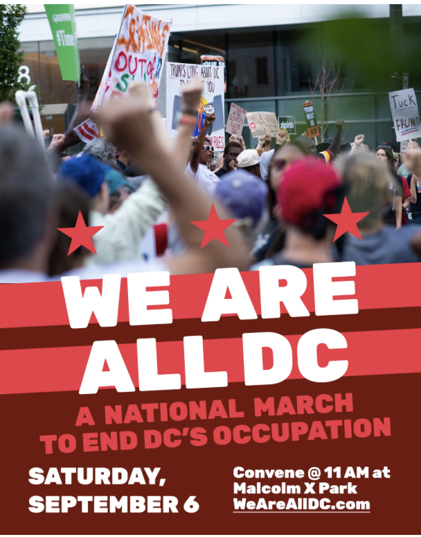 Free DC and partners will also be holding a We Are All D.C. National March on Saturday, September 6th and are are calling on communities across the country to join organizers in Washington, D.C., for a national march on the White House to demand that the federal forces leave DC immediately.
