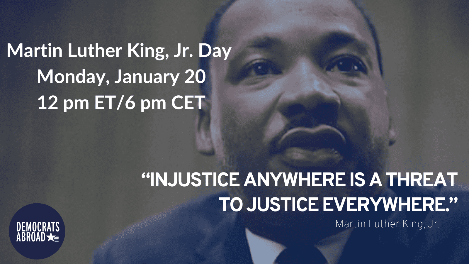 On Monday, January 20, 2025, the Democrats Abroad Canada Black Caucus invites you to join us in honoring the life and legacy of Dr. Martin Luther King Jr. by reaffirming our shared commitment to justice, equality, and the ongoing pursuit of "The Dream".