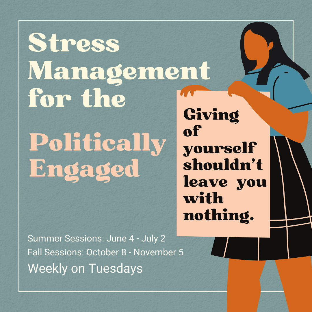 The current-events landscape is particularly challenging for politically engaged people. A lot of us are struggling with information overload, risk of burnout and general apathy when it comes to functioning in this political climate. How does one cope with the stresses of this environment and still effectively work toward justice?