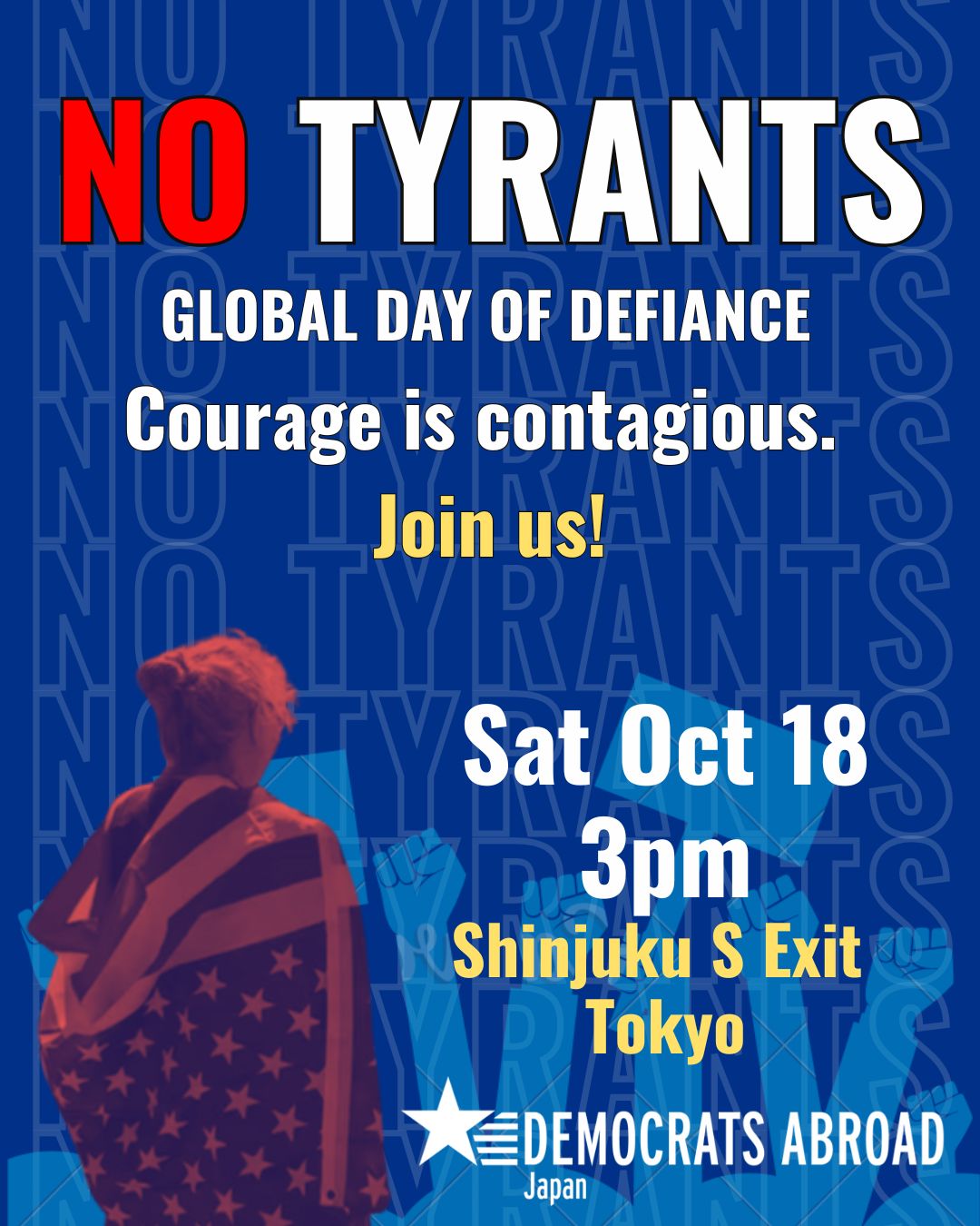 Join Democrats Abroad Japan on Sat Oct 18 3pm as we send a simple yet strong message to the corrupt and increasingly authoritarian Trump administration: No Tyrants will be tolerated. Come join us as we resist the Trump regime and stand up for our constitution and democracy!