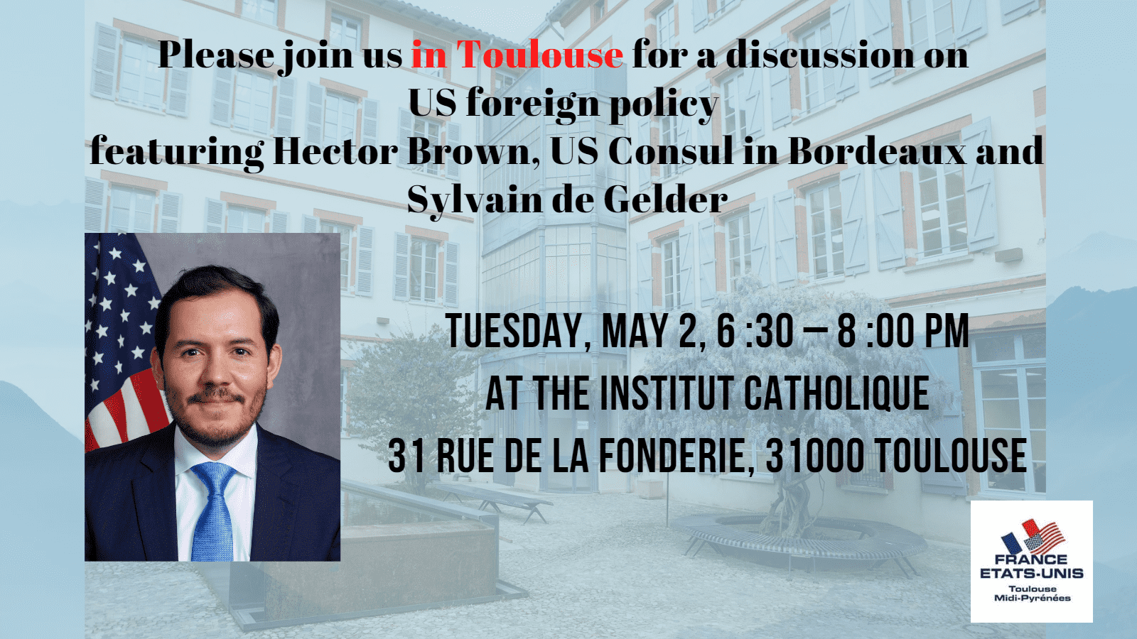 Please join the members of France Etats-Unis in Toulouse for a discussion on US Foreign Policy on May 2, at the Institut Catholique in Toulouse. Our speakers will be Hector Brown, the US Consul in Bordeaux, and Sylvain de Gelder, public diplomacy officer.