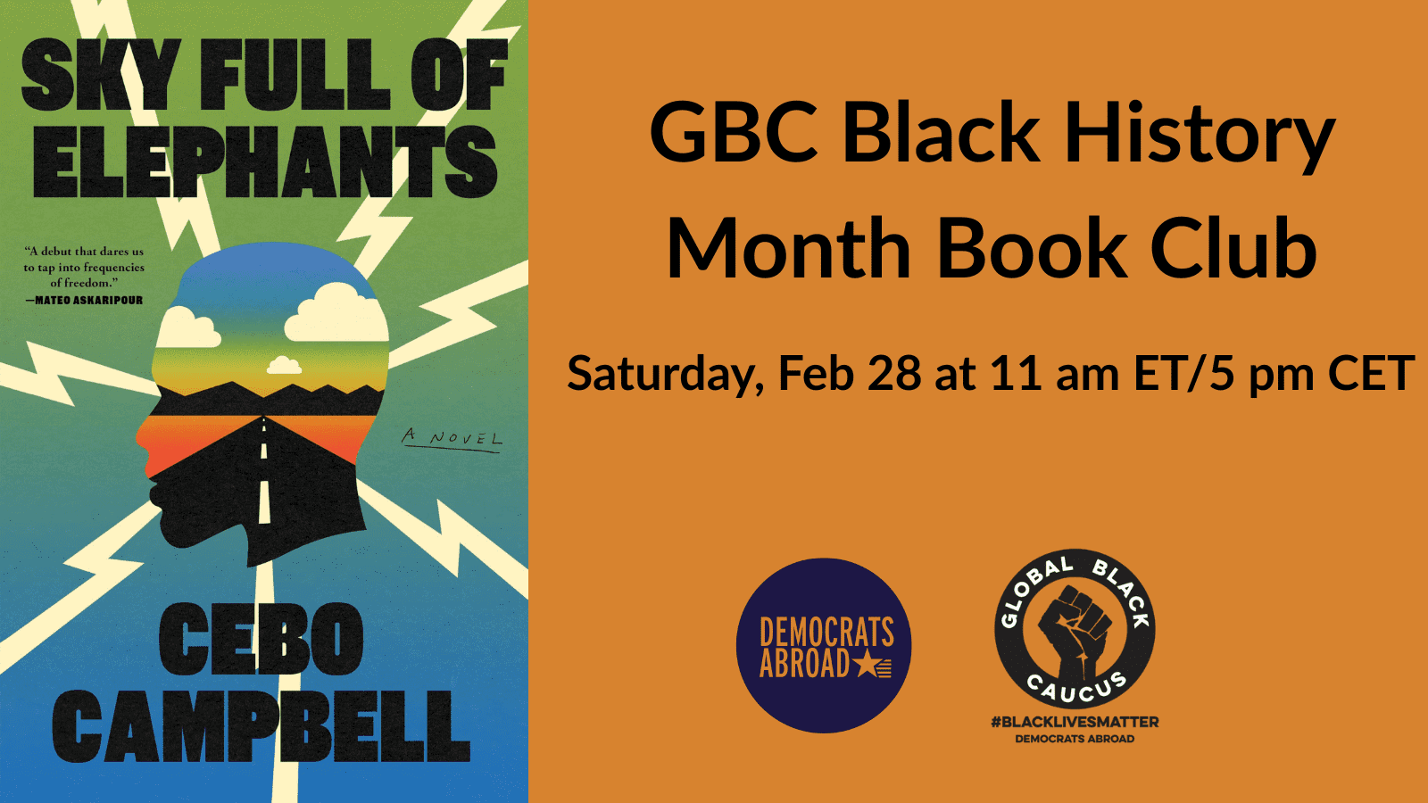 Join us on Saturday, February 28 at 11 am ET/5 pm CET for a Black History Month book club conversation on Sky Full of Elephants by Cebo Campbell — a daring, imaginative novel that asks what America becomes when whiteness suddenly disappears. Through the journey of Charlie and his daughter, Sidney, the story explores identity, grief, liberation, and the complicated work of rebuilding ourselves and our communities. Come ready for a thoughtful, provocative dialogue about race, memory, and the futures we dare to imagine.
