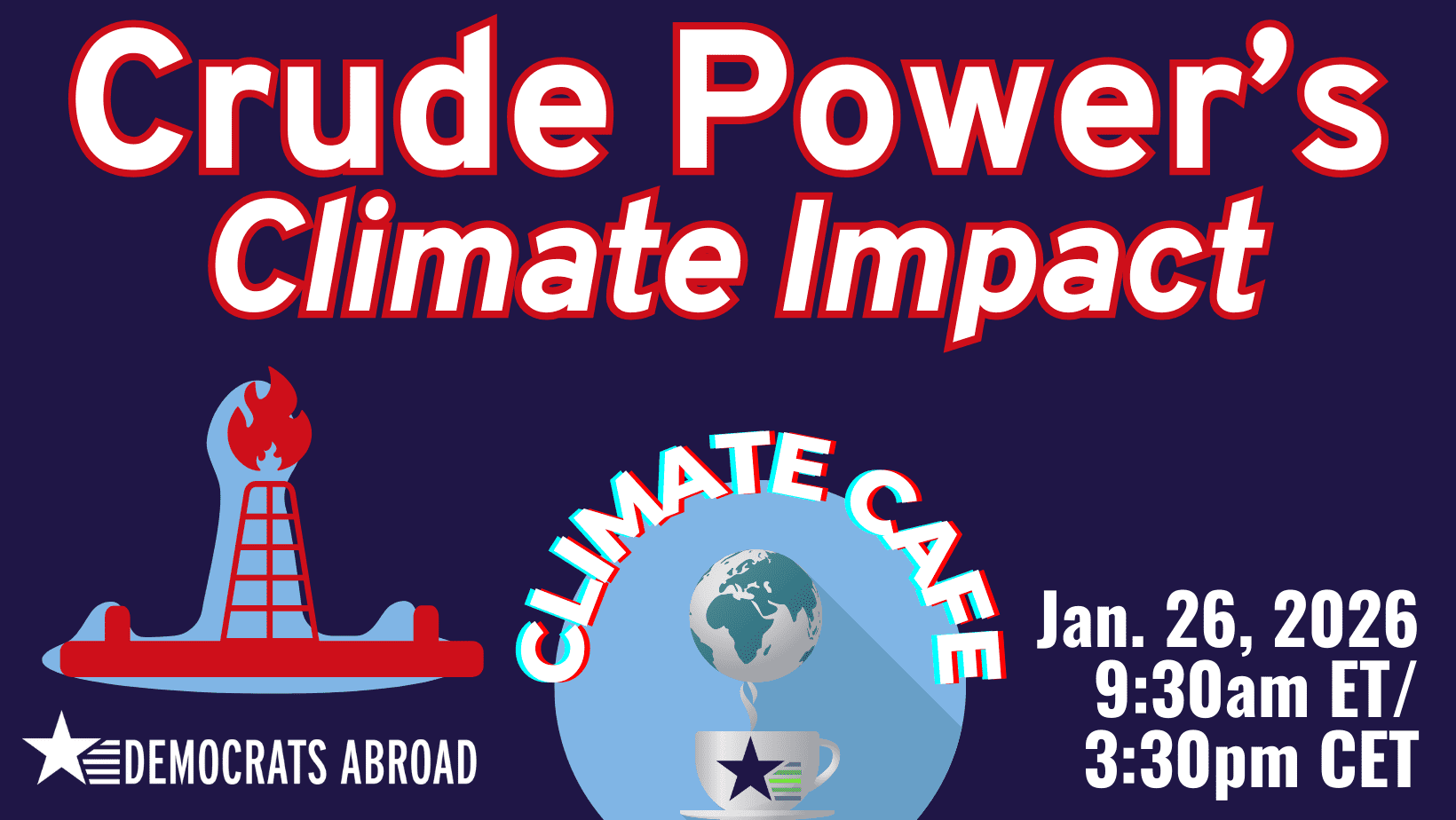Welcome to the Environment & Climate Crisis Council’s January Climate Café on Monday, the 26th at 9:30 am ET/3:30 pm CET. This month’s presentation and discussion, Crude Power’s Climate Impact will address the onerous impact of the MAGA administration’s ‘energy emergency’ and its crude power grab for fossil fuels on global emissions and planetary health.