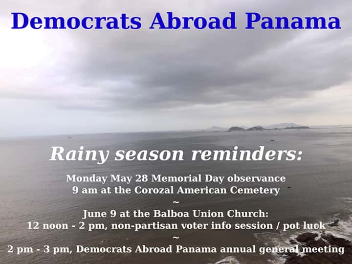 Democrats Abroad Panama will hold our Annual General Meeting of all active Democrats in Panama on Saturday, June 9 from 12 noon to 3 pm at Balboa Union Church in Panama City.