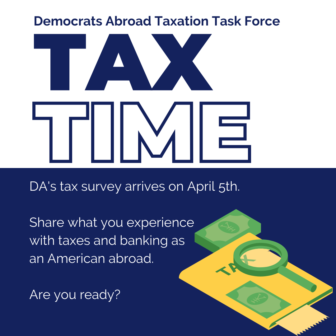 Get ready to tell us all about what you think about taxes and banking while living abroad. The Democrats Abroad tax survey launches on April 5th. We are encouraging all Americans abroad to complete the survey, to help us capture an up to date picture on what filing taxes from abroad looks like and how FATCA is impacting Americans abroad ability to bank.