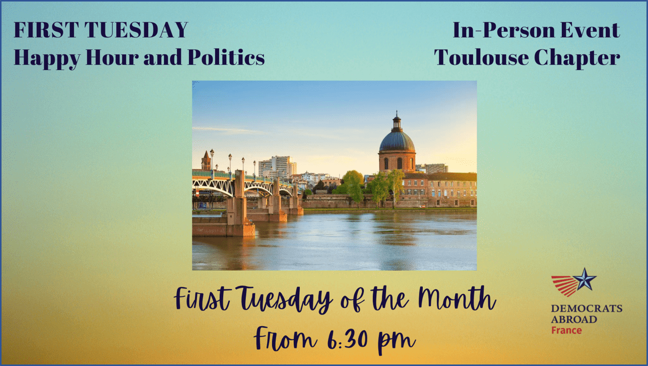 Please join us on the first Tuesday of November at 6:30 pm at the Black Lion Pub, 4 allées Paul Feuga, Toulouse, just around the corner from the Palais de Justice metro station. First Tuesday events are informal social gatherings, a nice opportunity to socialize and discuss politics with fellow Democrats. Depending on the number of RSVPs, we may be at separate tables, but that will mean more interaction!