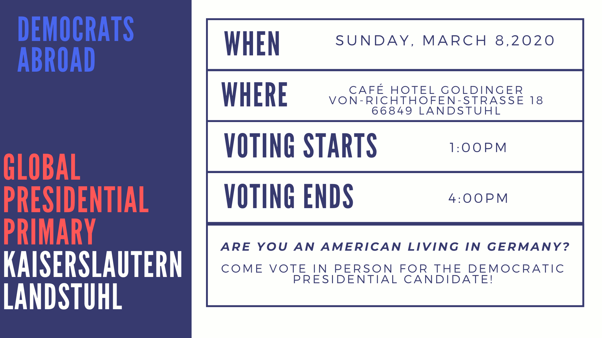 As a Democrats Abroad member, you're already all set to vote in our Kaiserslautern Global Presidential Primary on March 8th in Landstuhl to support your Democratic presidential candidate.